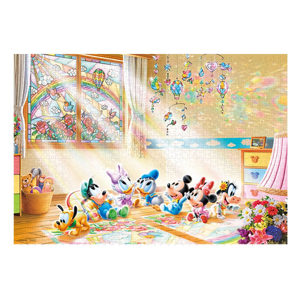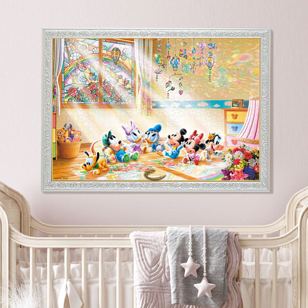 楽し気な声に誘われて近づいてみると、そこはベビーミッキーたちのお部屋。ステンドグラスやモビールが、壁や床いっぱいに鮮やかな光のアートを描き出しています。まるで夢のようなこの光景は、ベビーたちへお陽さまからのステキなプレゼントかもしれませんね!?パズル完成後は別売の専用パネルに入れて飾れば、お部屋を彩るステキなインテリアに!