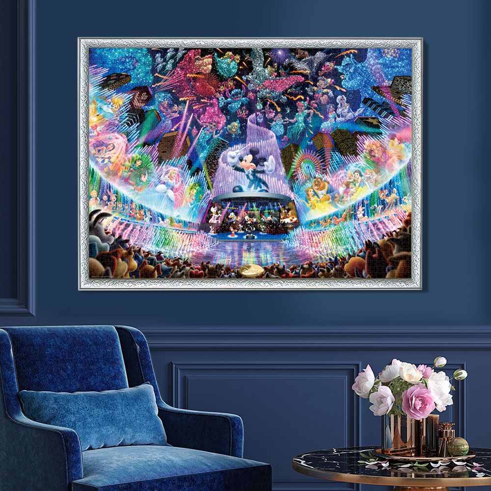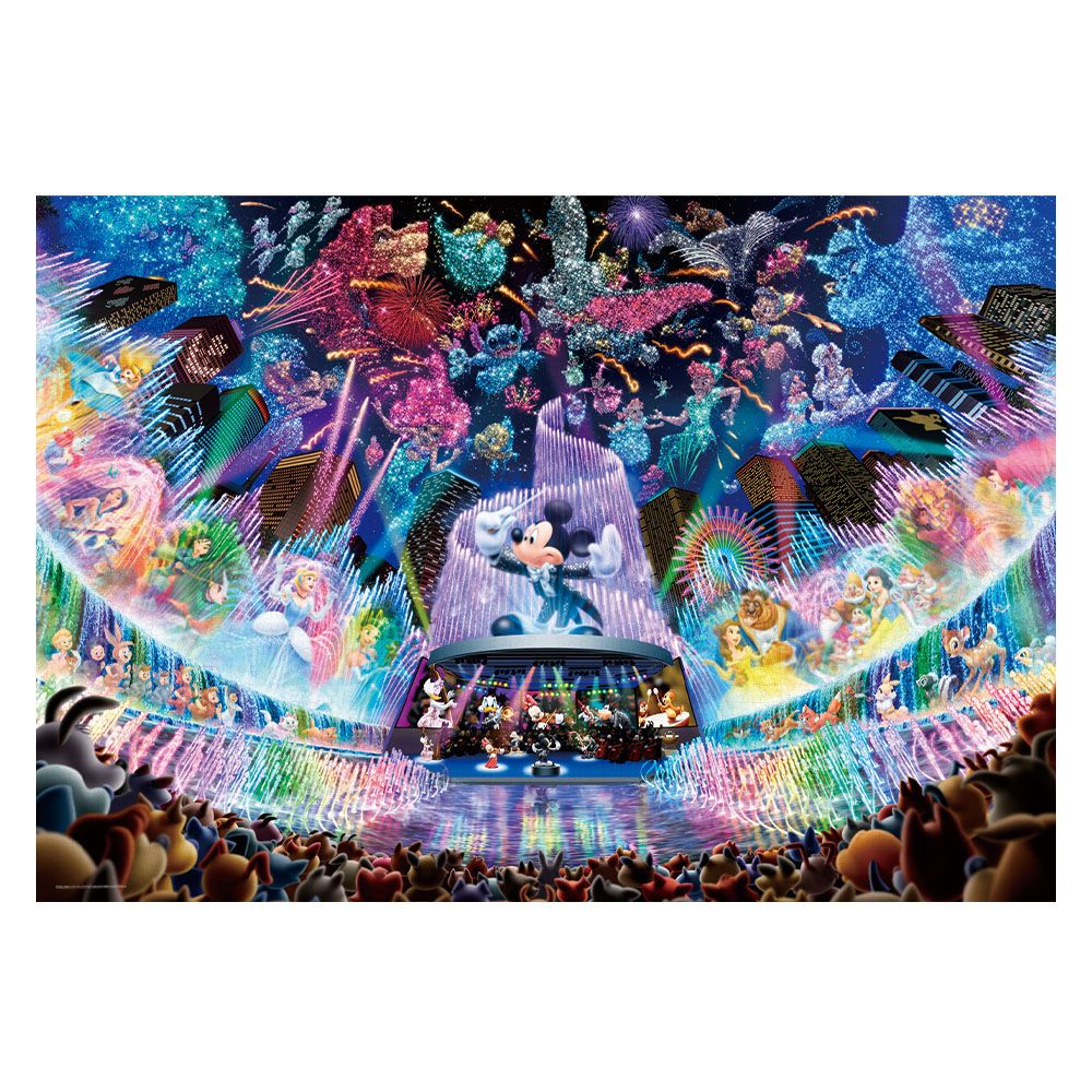 登場キャラクター数80、映画にして26本。美しい噴水、鮮やかな光、感動の音楽が出会う、夢の水上コンサート。みんなの指揮を執るのはもちろんミッキー!水上で繰り広げられる幻想的で迫力のある世界を、光を蓄えて暗いところで光る光るジグソーパズルで、より美しく浮かび上がらせます。