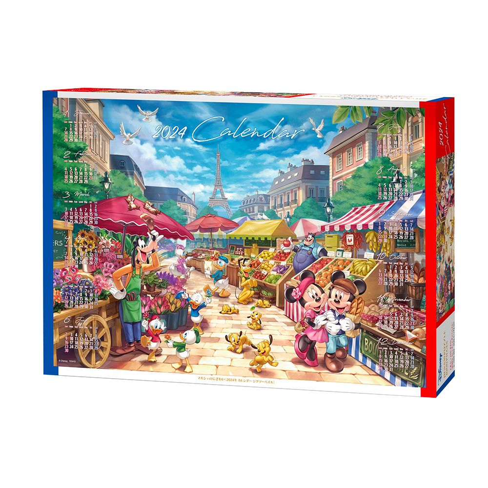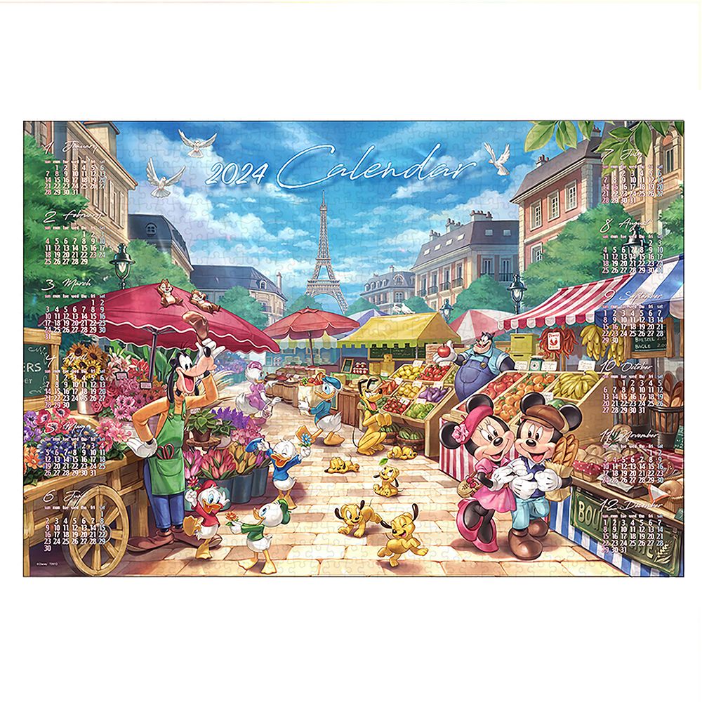 パリの市場「マルシェ」で、楽しくお買い物!いつもたくさんの品々が並び、活気にあふれています!!2024年に、オリンピックが開催されるこの街の〈カレンダー ジグソーパズル〉を組んで、ミッキーたちのように、生き生きと明るい気分で1年を過ごしてみませんか?