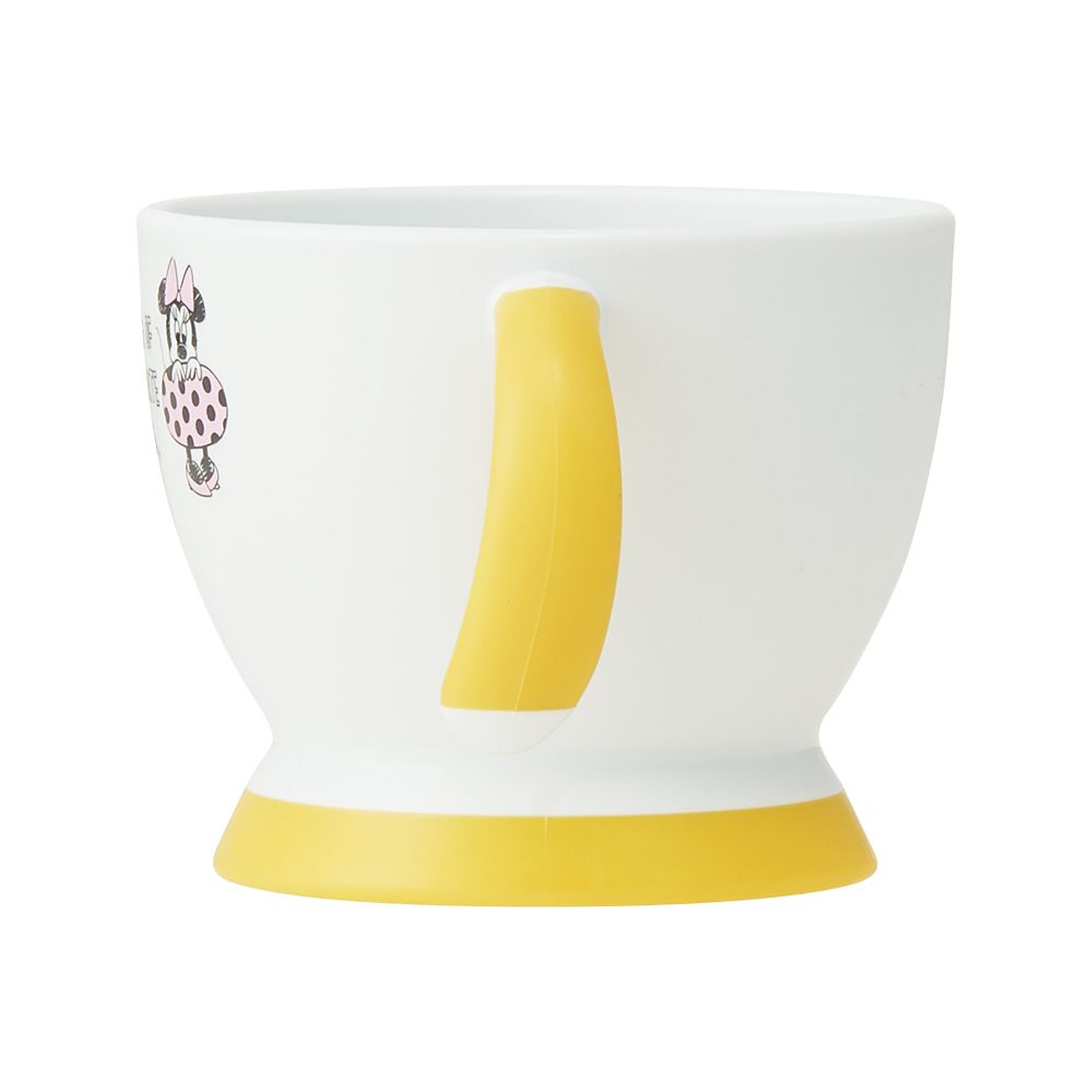 手前に曲がっていて両手で握りやすい持ち手と、すそ広がりで倒れにくい形状がポイントの両手持ちコップです。