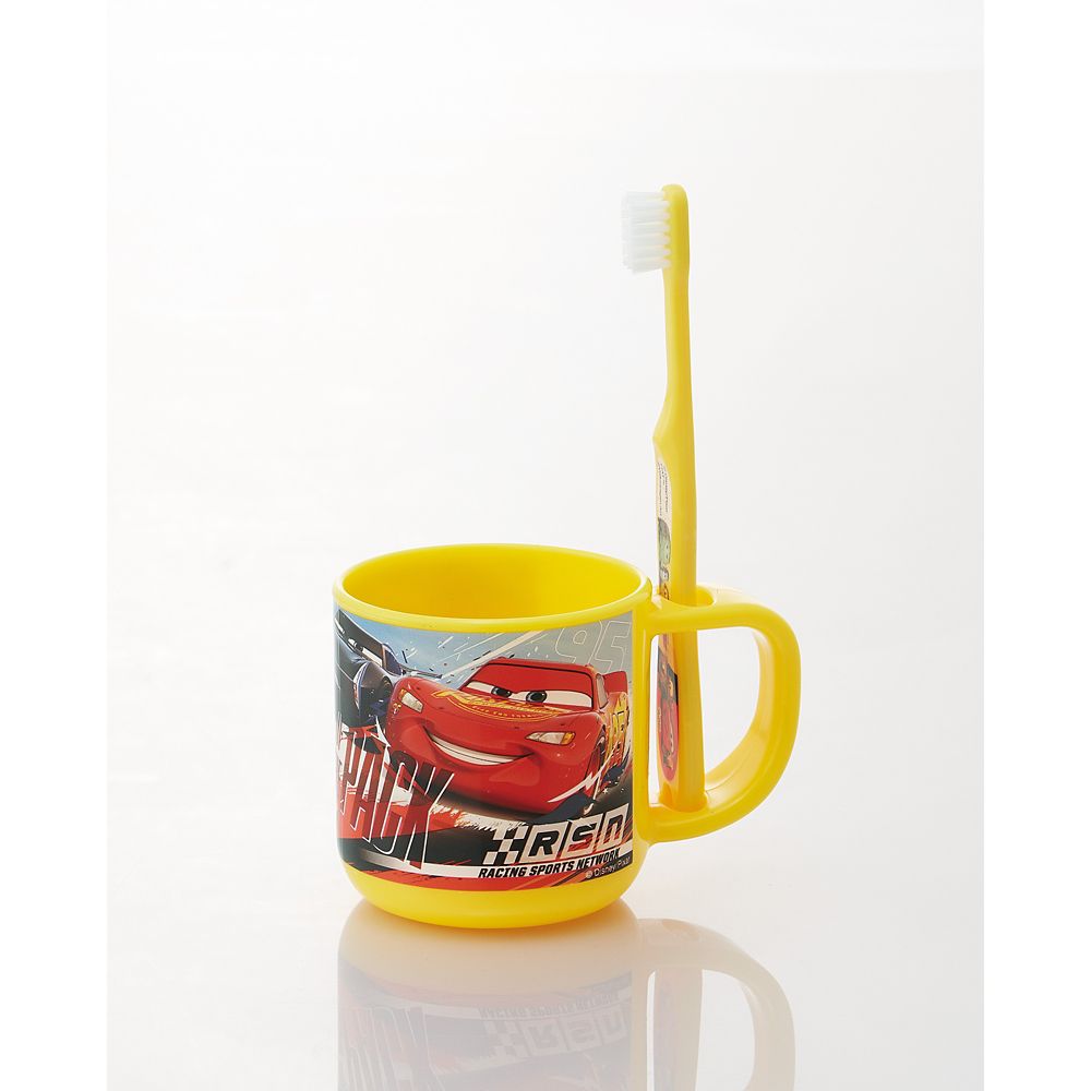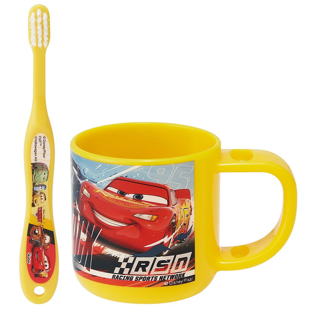 持ち手に歯ブラシを立てられるコップと、園児用の歯ブラシのセット。