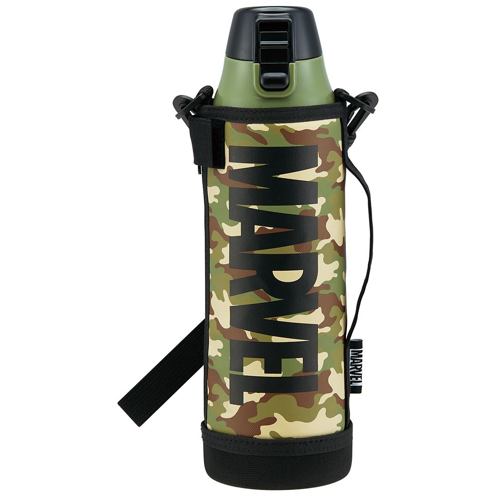 キズつきを防ぎ、丈夫な底で衝撃から守るボトルカバーには、肩から掛けられるショルダーベルトと、飲むときに持ちやすいハンドホルダー付き。