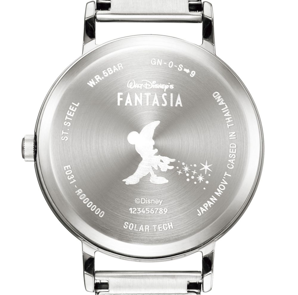 裏ぶたには魔法をかけるミッキーのシルエットを刻印。ペアにして並べると、ミッキーがかけた魔法がお互いの文字板を彩っていくようなデザインになっています。