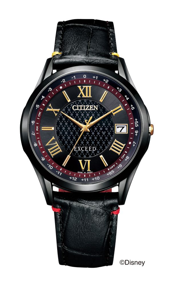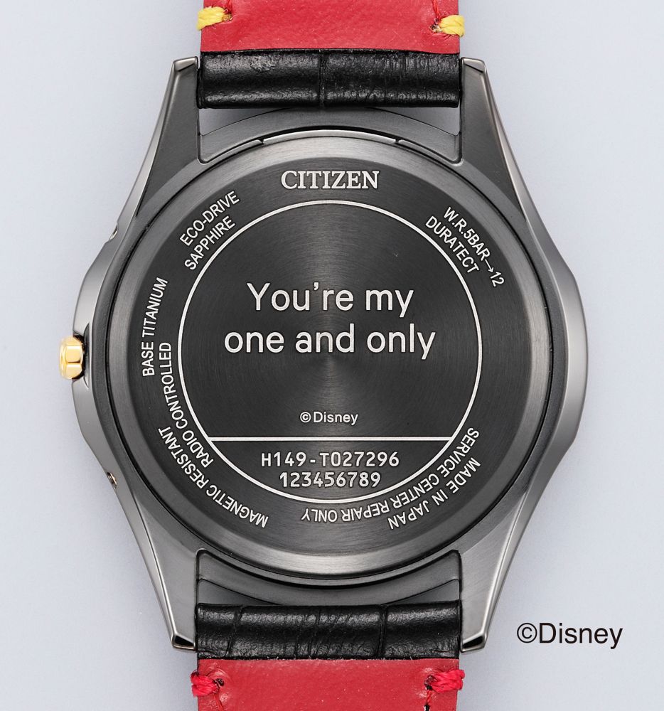 ケース、バンド、インデックスなどにミッキーを連想させるカラーリングを採用。ミッキーとミニーの誕生日11/18にちなんで、11時と18を示す位置に〇印を配置しています。