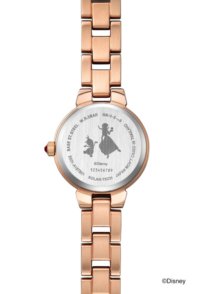 文字板に、ドレスやアレンデール城の装飾を思わせるノルディック調の花柄を描き、12時と6時の位置には2ポイントのクリスタルをセッティング。