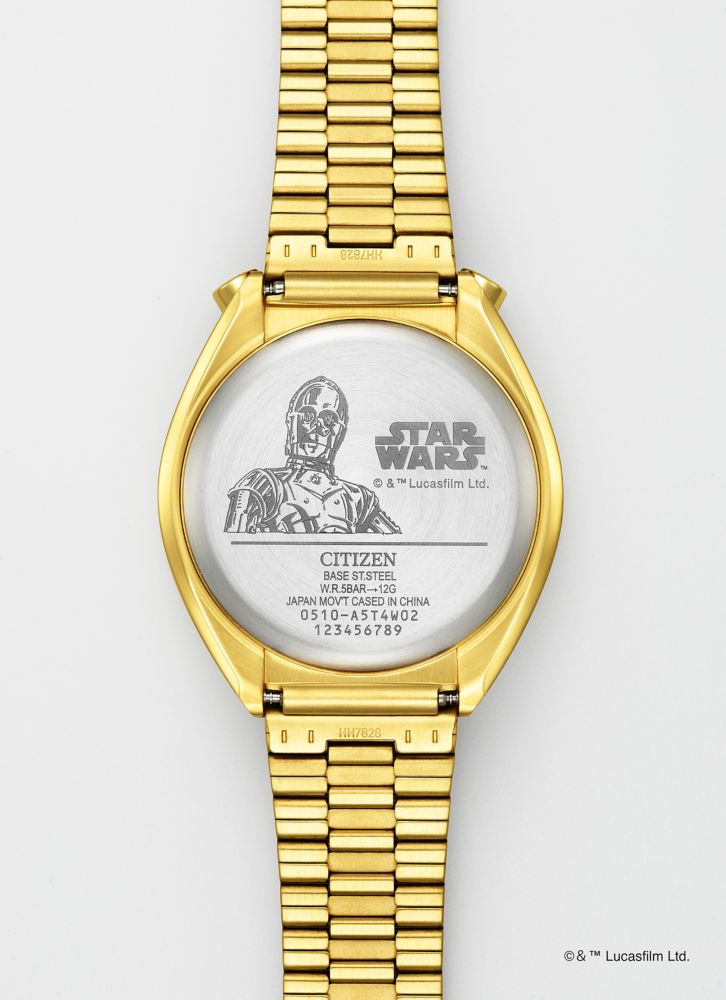 象徴的なゴールドのカラーリングのみならず、文字板を二層の構造にすることでC-3POの顔を立体的に表現。