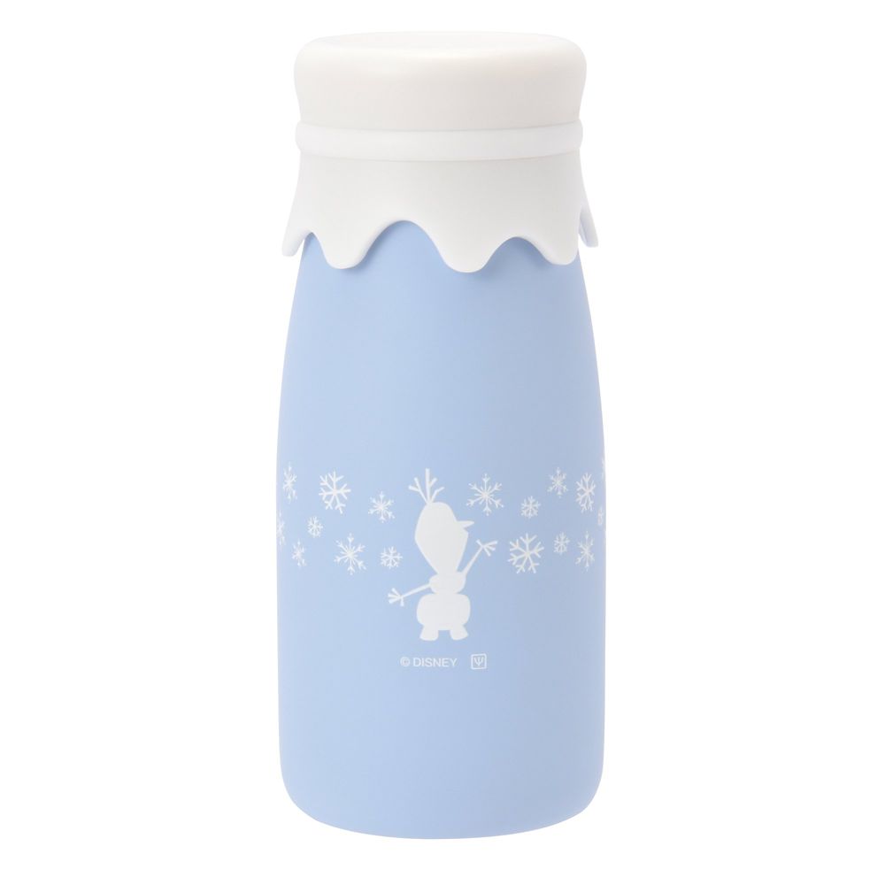 白いフタ、青い素地のボトルはまさに雪山!表面にはアナとエルサ、裏面にはオラフのシルエットがデザインされています。