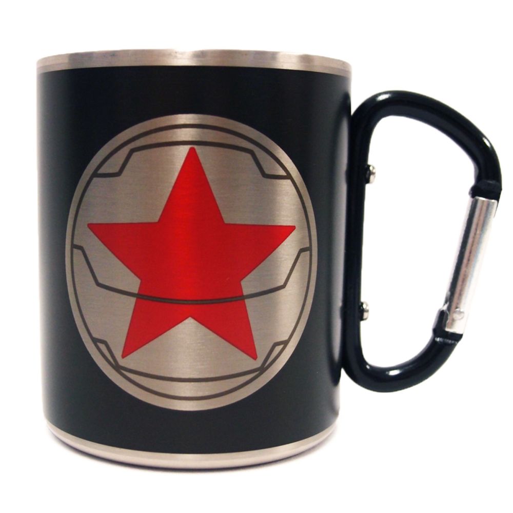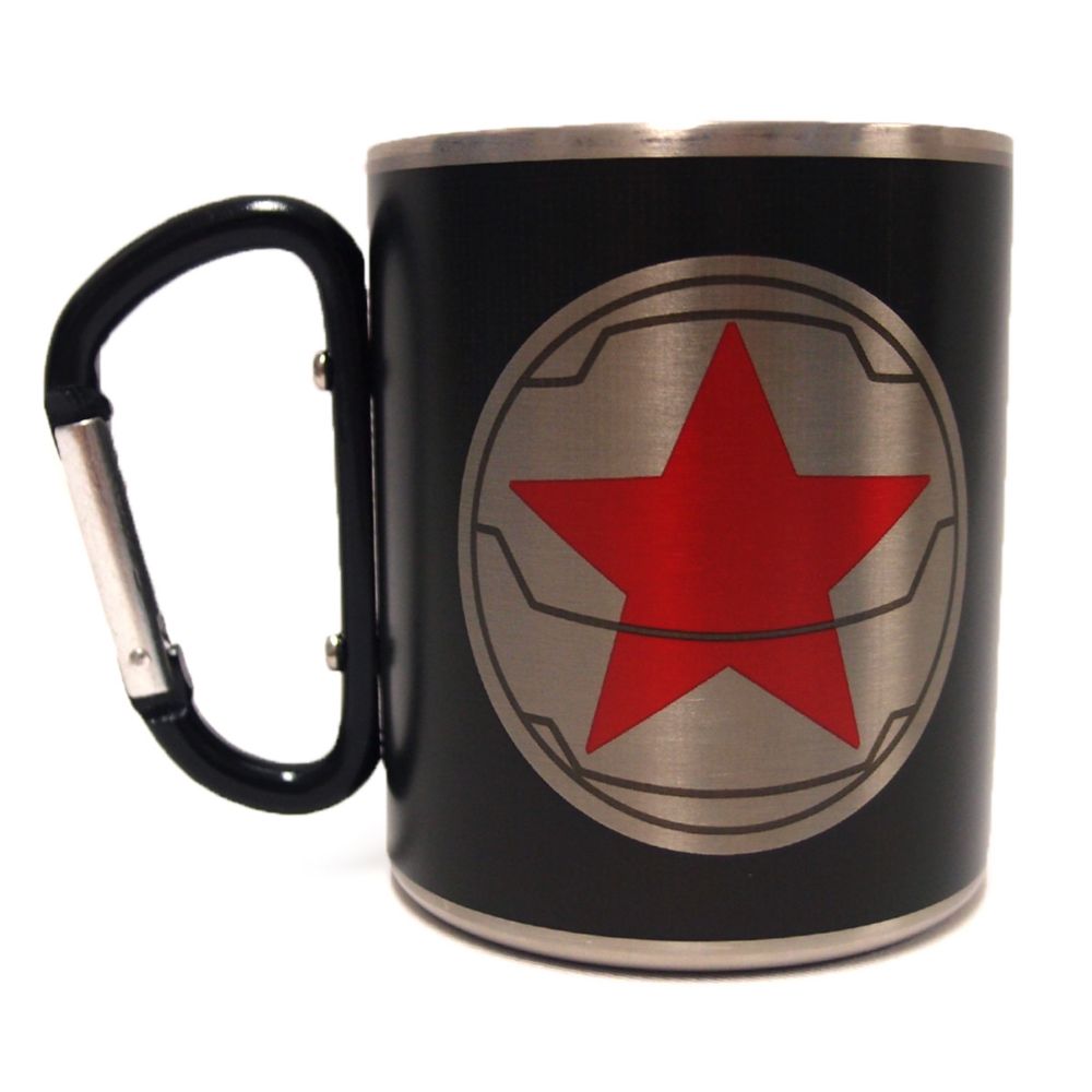 持ち手部分がカラビナになっているマグはステンレス製なので、アウトドアにも便利。