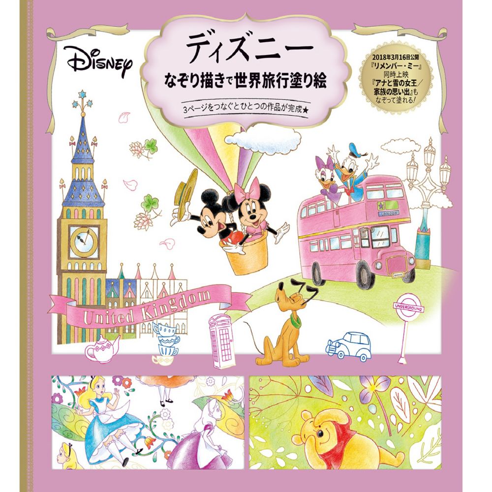 ディズニーキャラクターや世界各国のモチーフをなぞって塗って旅行気分を楽しみましょう!世界中を旅するミッキー&フレンズをはじめとし、2018年3月公開の『リメンバー・ミー』『アナと雪の女王/家族の思い出』の他、『くまのプーさん』、『ふしぎの国のアリス』など、3ページひと組で28作品を収録しています。