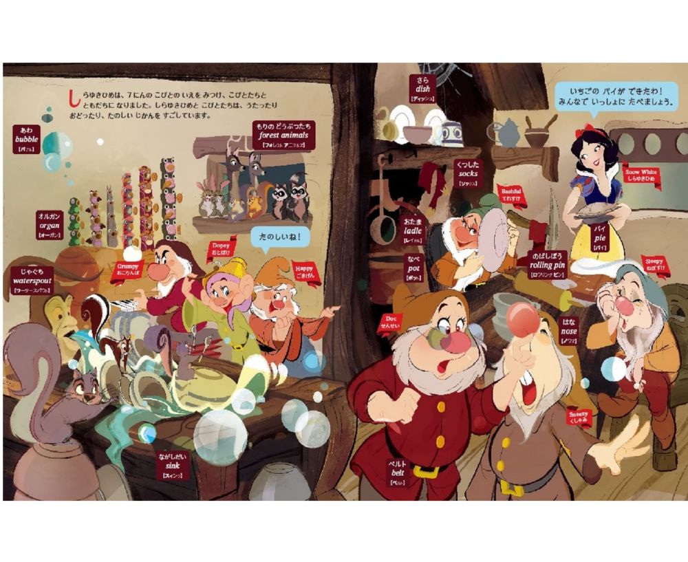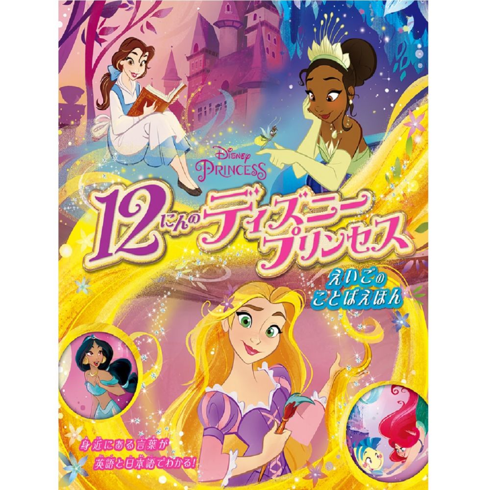 12人のディズニープリンセスのお話の名場面の一部を読みながら、身近にいる動物の名前やものの名前などを英語と日本語の2言語で学べる絵本です。
