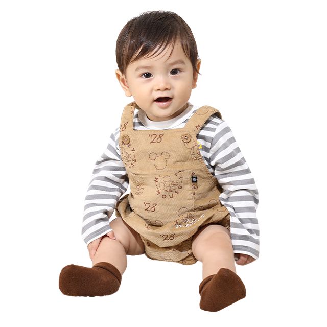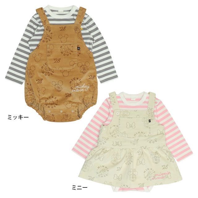 【ベビードール】ミッキー コーデュロイ サロペットロンパース 2点セット 0043B / ベビーサイズ 出産祝い セットアイテム ストレッチコーデュロイ ボーダー 長袖 ロンT ボディスーツ 肩紐調整可 股下スナップボタン