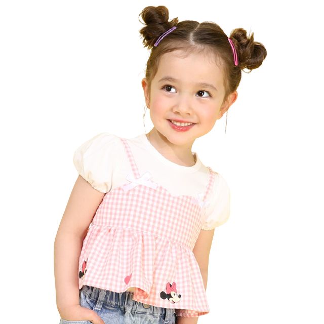 【ベビードール】ミニー Tシャツ&チェックキャミセット 0319K / ベビーサイズ キッズ トップス コーデセット レイヤード 半袖 パフ袖 キャミソール 天竺素材 肩紐長さ調整可