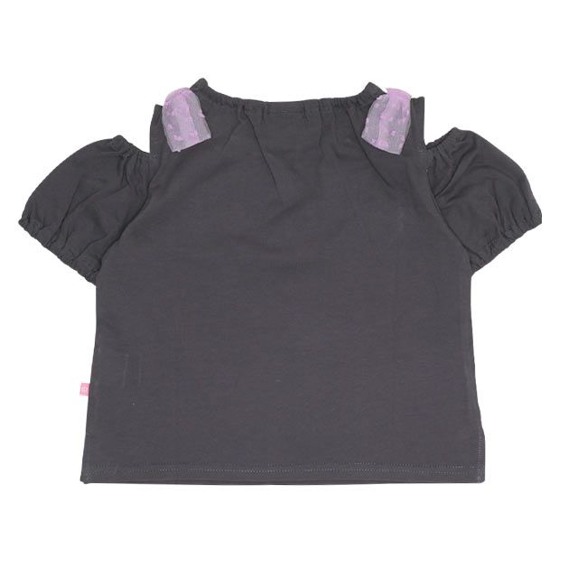 ちょい見せの肩あきデザインにチュールのリボンが付いたガーリーなTシャツ♪