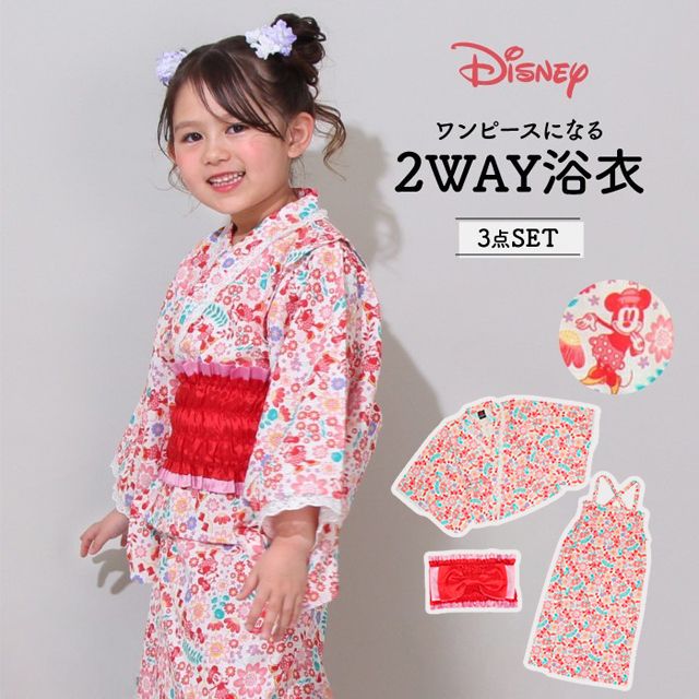 【ベビードール】ミニー 2WAY浴衣ワンピース 0431K / 90cm-140cm キッズ セパレートタイプ 3点セット 半袖 ワンピ ロングスカート 作り帯 胸部総ゴム(ギャザー) 肩紐長さ調整可(2段階/取り外し不可)