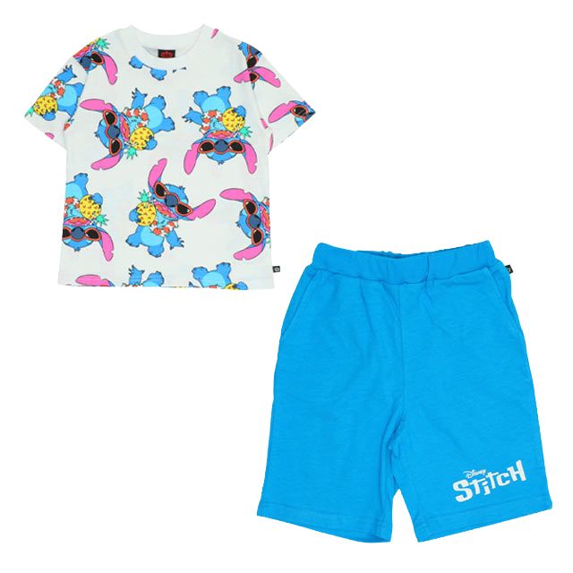 【ベビードール】スティッチ 総柄 Tシャツ&ハーフパンツ 2点セット 0482K / ベビーサイズ キッズ トップス ボトムス 半袖 短パン 半ズボン ウエスト総ゴム ゴム穴付 上下セットアップ コーデセット