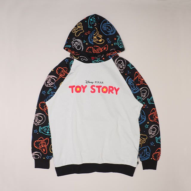 ネオン風のキャラクターアートがおしゃれなTOY STORYのスウェットパーカー♪