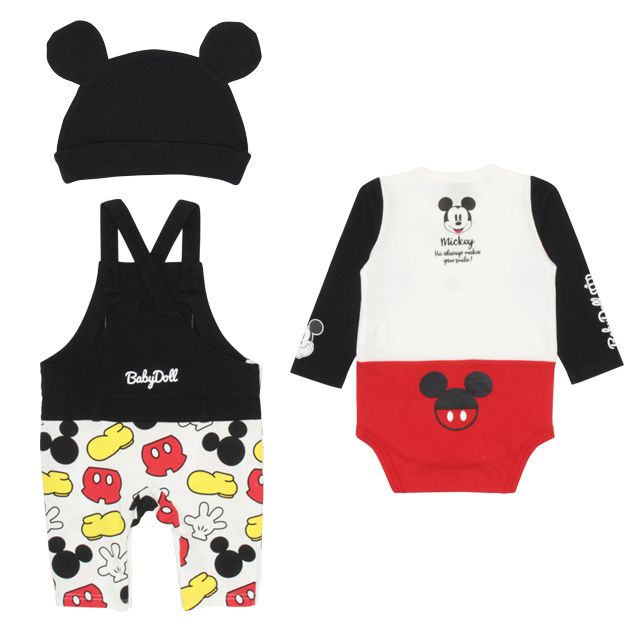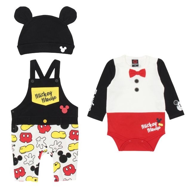ミッキーデザインは長袖ボディスーツ、サロペットロンパース、耳付き帽子の3点