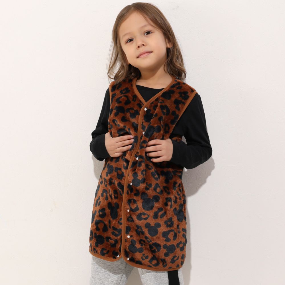 ベビーサイズ キッズ 男の子 こども 子ども服 ベスト ジレ ふわふわ もこもこ スリーパー お部屋着 アニマル柄 総柄 ヒョウ柄 ポップ カラフル フードなし 防寒 寒さ対策 かっこいい お洒落 おしゃれ 可愛い かわいい