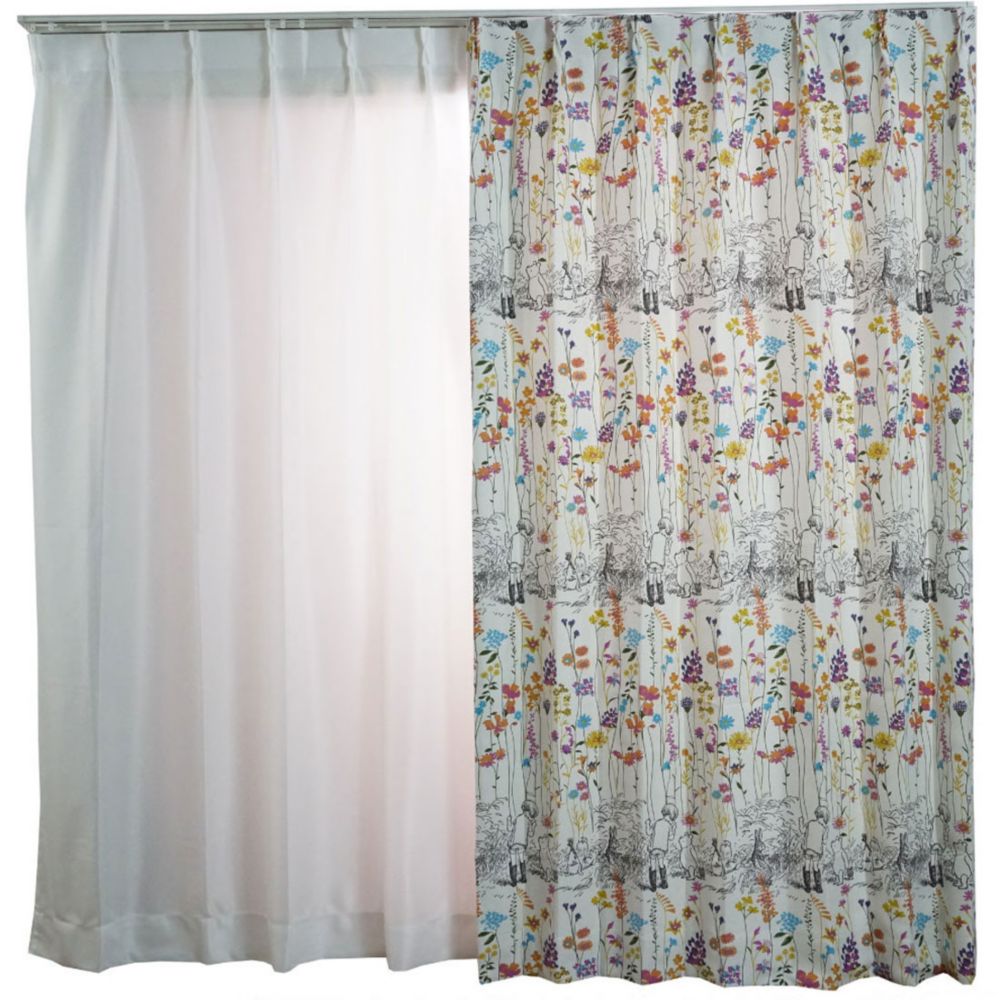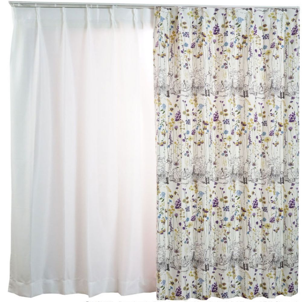 プーとクリストファー・ロビン、仲間たちがお花畑の中で遊んでいる楽しいデザインです。カラフルな花々が咲き誇る華やかな雰囲気のドレープです。