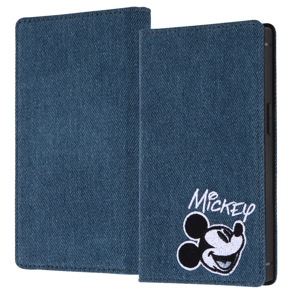 デニム生地にワンポイント刺繍。液晶画面や背面を衝撃から護る手帳型ケース。カメラ穴がないため傷が付きにくく、誤撮影の心配がない。ケースを回して簡単にカメラ撮影。内側ケースだけでもスリムに使用可能。『ミッキー&フレンズ』 ミッキー ( ミッキーマウス )