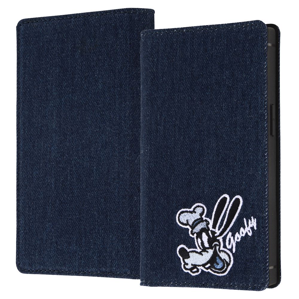 デニム生地にワンポイント刺繍。液晶画面や背面を衝撃から護る手帳型ケース。カメラ穴がないため傷が付きにくく、誤撮影の心配がない。ケースを回して簡単にカメラ撮影。内側ケースだけでもスリムに使用可能。『ミッキー&フレンズ』 グーフィー