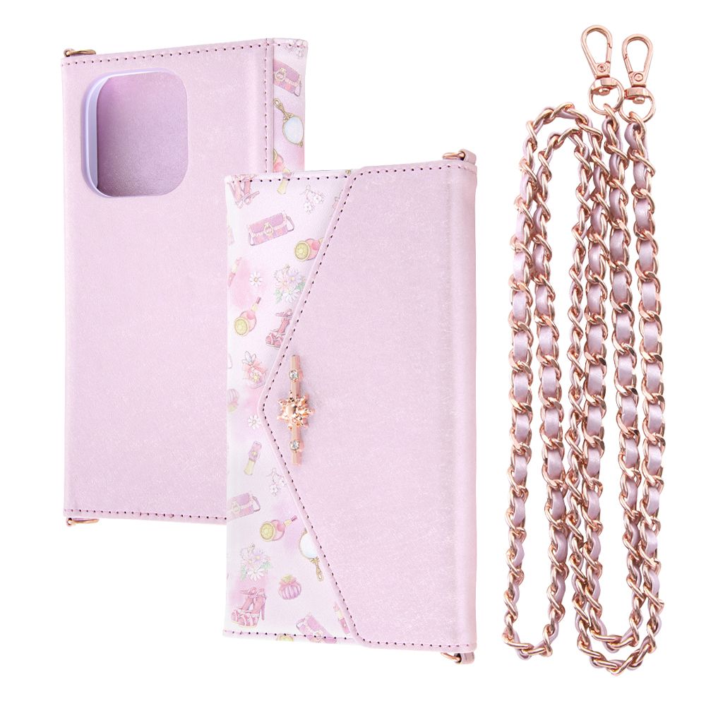 ショルダーストラップ付きでオシャレに持ち歩き。機能たっぷりの三つ折りタイプ。スナップボタンでしっかり留めるから安心。いつでも身だしなみチェックができるミラー付き。ICカードポケット・収納ポケット付き。チェーンやアクセサリーなどがつけられるDリング付き。