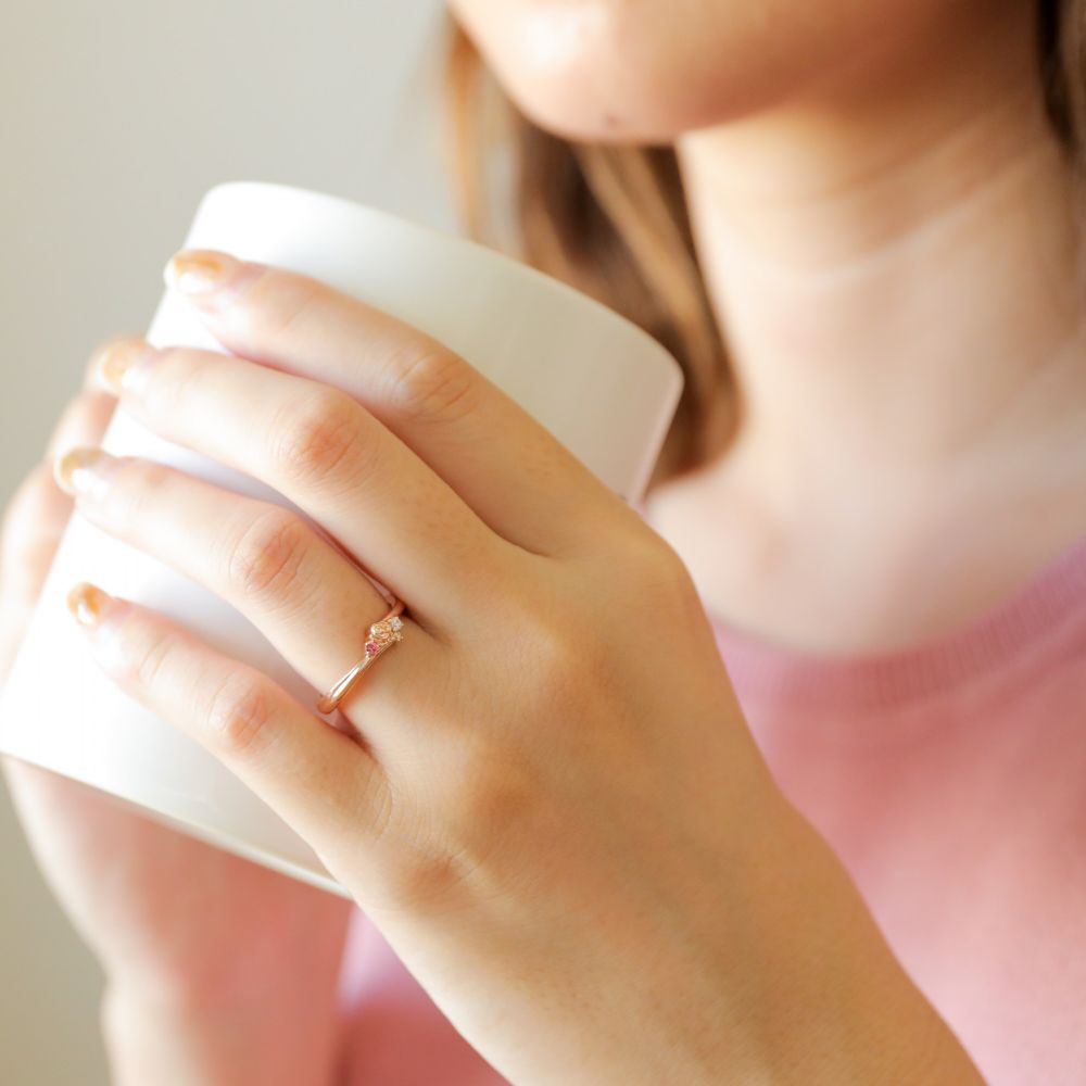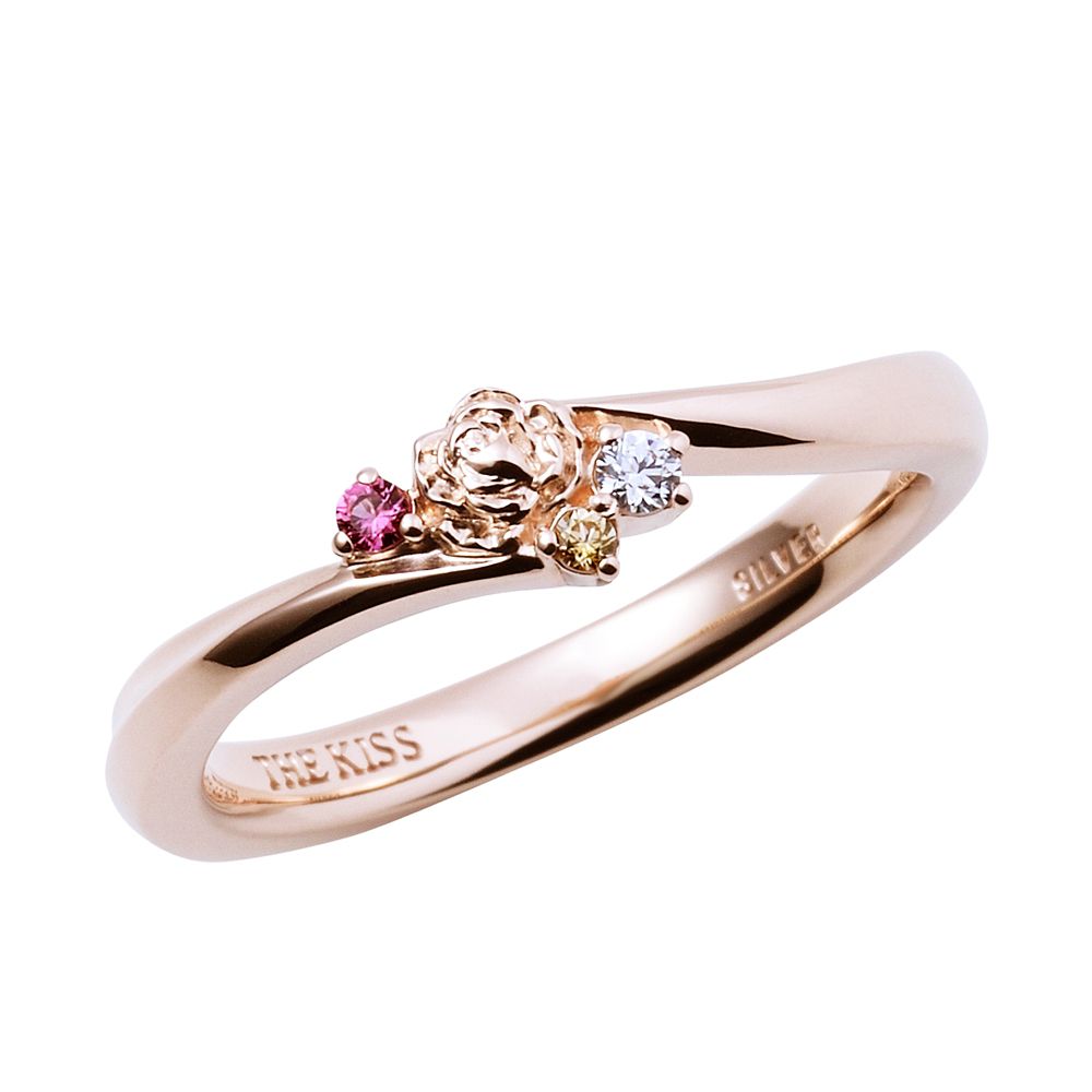 ベルのドレスや、赤いバラをイメージしたカラーストーンのきらめきが美しいリング。