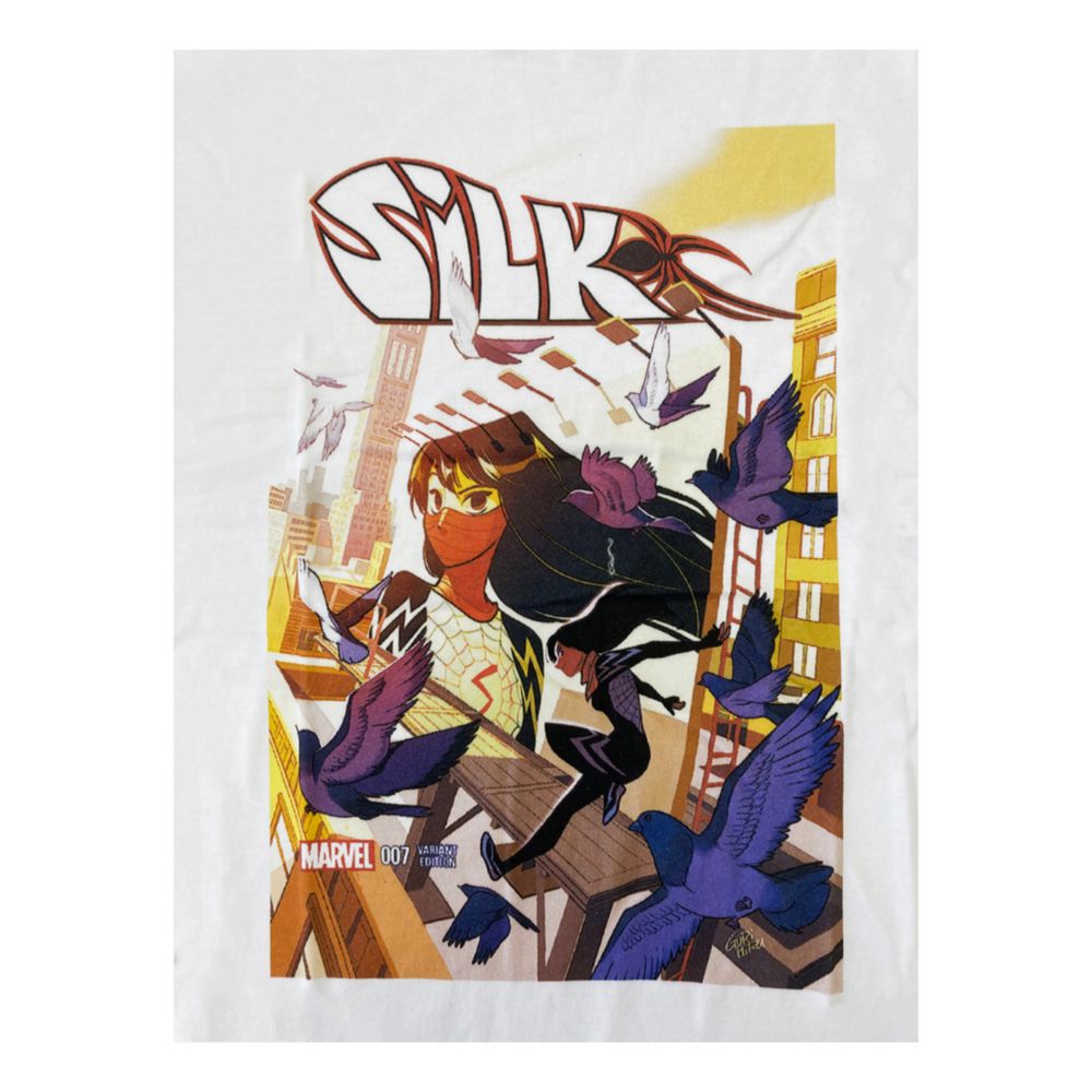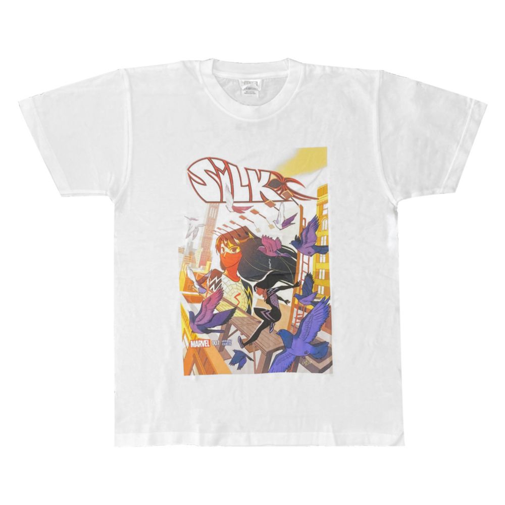 マーベルコミック、「スパイダーマン」に登場する女性ヒーロー、シルクを描いたデザインTシャツ。インクジェットプリントを使用してるので綺麗なフルカラーを表現しています。マーベルファン必見のTシャツです。