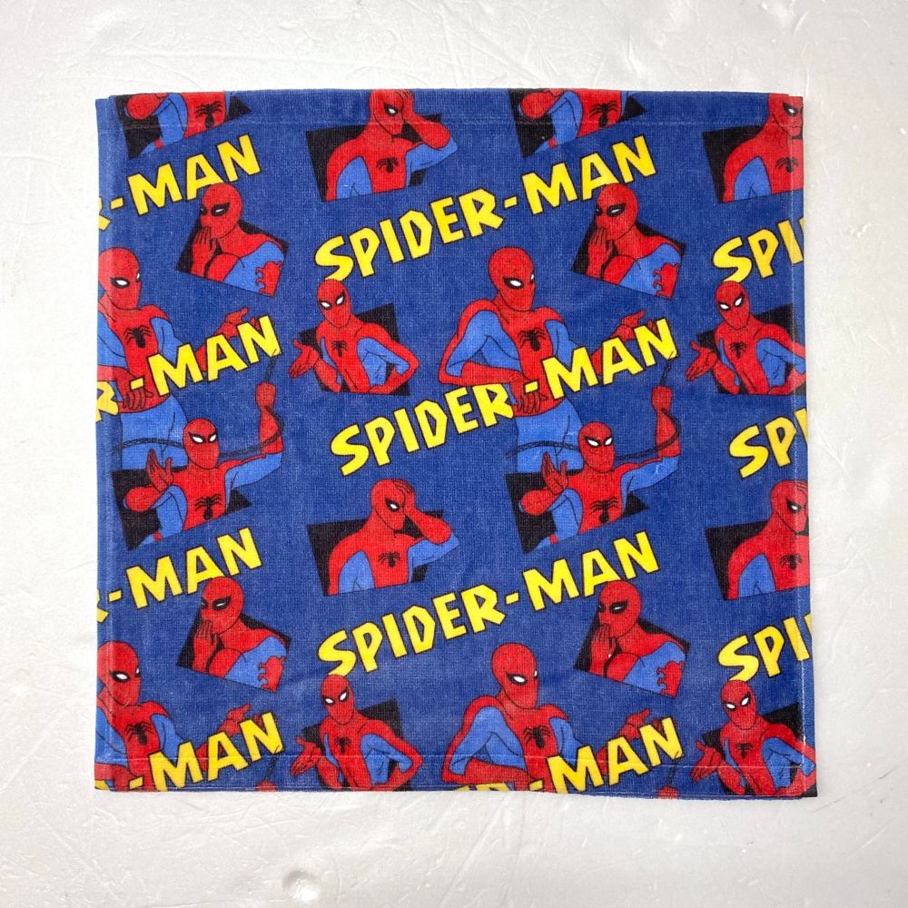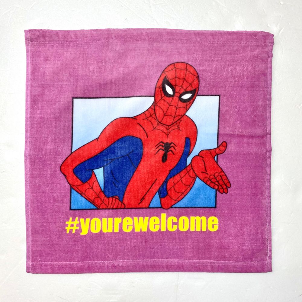 コミックシーンの一コマを描いたようなスパイダーマンのハンドタオル。