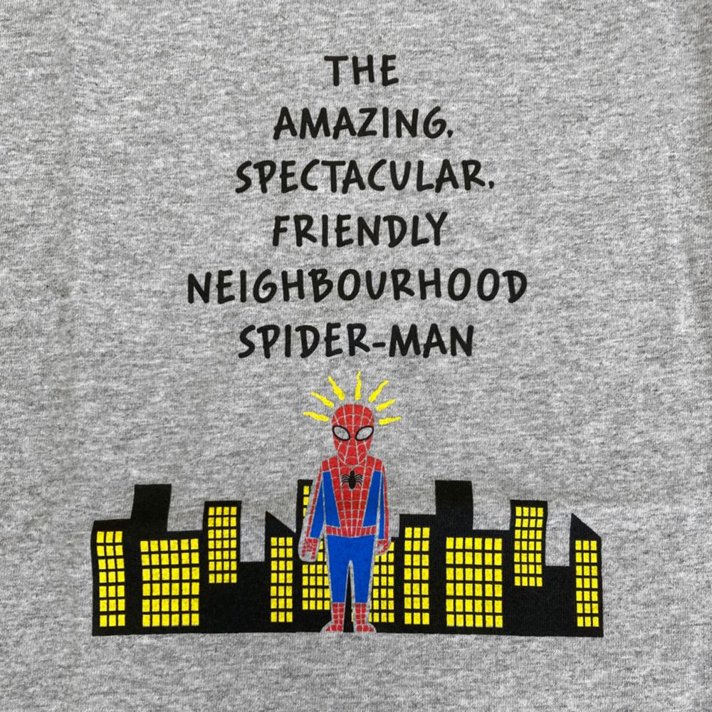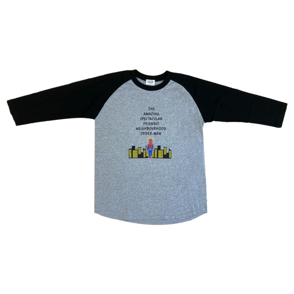 「夜の街中のスパイダーマンをかわいく描かれた7分袖Tシャツ。グレー×ブラック配色のラグランスリーブデザインなので、アメカジ風に着こなしても90’sっぽっくてオシャレ度アップです。マーベルファン必見のTシャツです。
