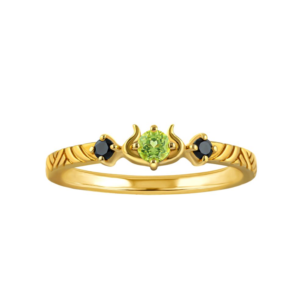 メインストーンにはペリドットを使い「マレウス・ドラコニア」の瞳や衣装の色を表現し、ドラゴンの角をイメージした石枠にしています。