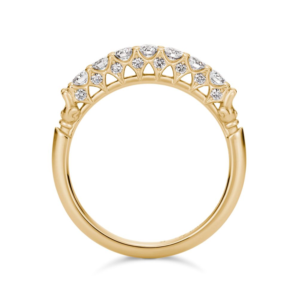 ダイヤモンドの輝きを存分に感じられるよう石座部分を透かしで作りこみ、側面にもダイヤモンドを留めた存在感あふれるデザイン。