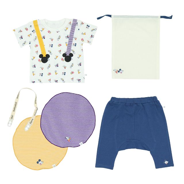 【ベビードール】ミッキー ギフトBOX付き 5点ギフトセット 6262B 【DY】 / ベビーサイズ 赤ちゃん 出産祝い 贈り物 プレゼント ベビー服 ベビー用品 半袖 Tシャツ ズボン モンキーパンツ スタイ クリップ 巾着 コーデセット