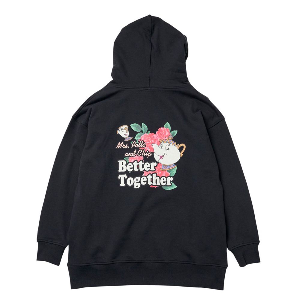 バックにはポット夫人とチップのコンビのグラフィック、フロントは刺繍ロゴでシンプルにもあわせやすいデザインです。