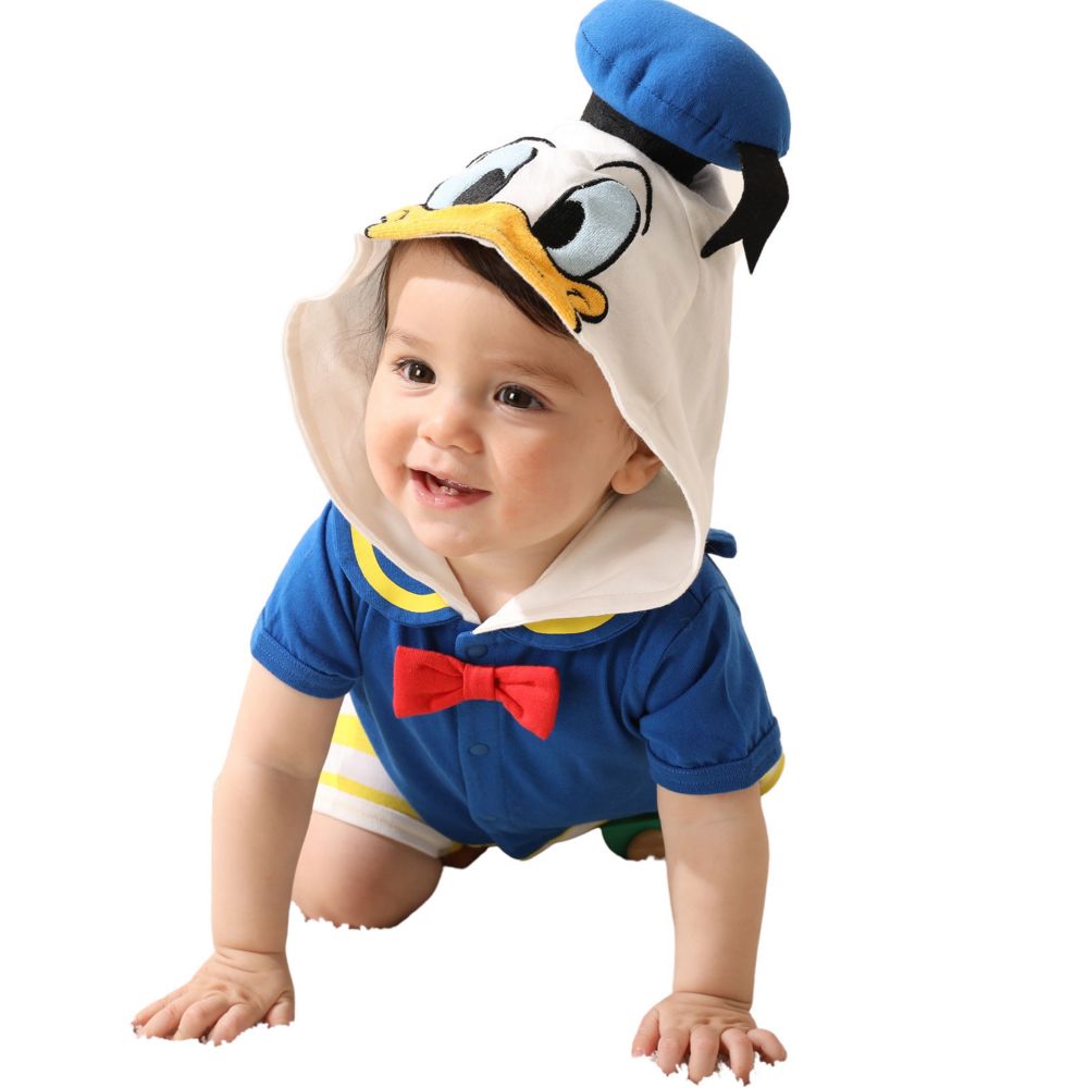 【ベビードール】ドナルド なりきるロンパース 7874B / ベビーサイズ 赤ちゃん 出産祝い 贈り物 プレゼント ベビー服 フード付き 立体モチーフ スナップボタン センター開き 仮装 コスチューム コスプレ