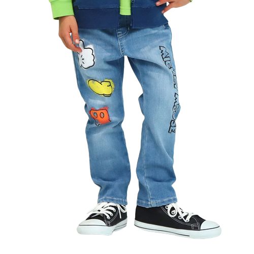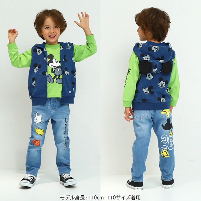 【ベビードール】ミッキー スプレー柄デニムロングパンツ 8017K / ベビーサイズ キッズ ボトムス 長ズボン デニムパンツ ジーパン ウエスト総ゴム ゴム穴付 ベルトループ フェイクボタン