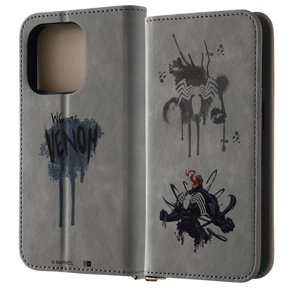 洗練された大人の手帳型ケース"Raffine"表情のあるむら染めPUレザーとトープ色のPUレザーを組み合わせた、『ヴェノム』のデザインがプリントされた手帳型ケース。マグネットを使用していないため、磁気が入ったカード等も収納いただけます。キャラクター名: ヴェノム ( VENOM )( エディ・ブロック )ストラップホール付き エディ・ブロック アメコミ コミック ヒーロー クモ グレー 灰色 MARVEL マーベル まーべる でぃずにー