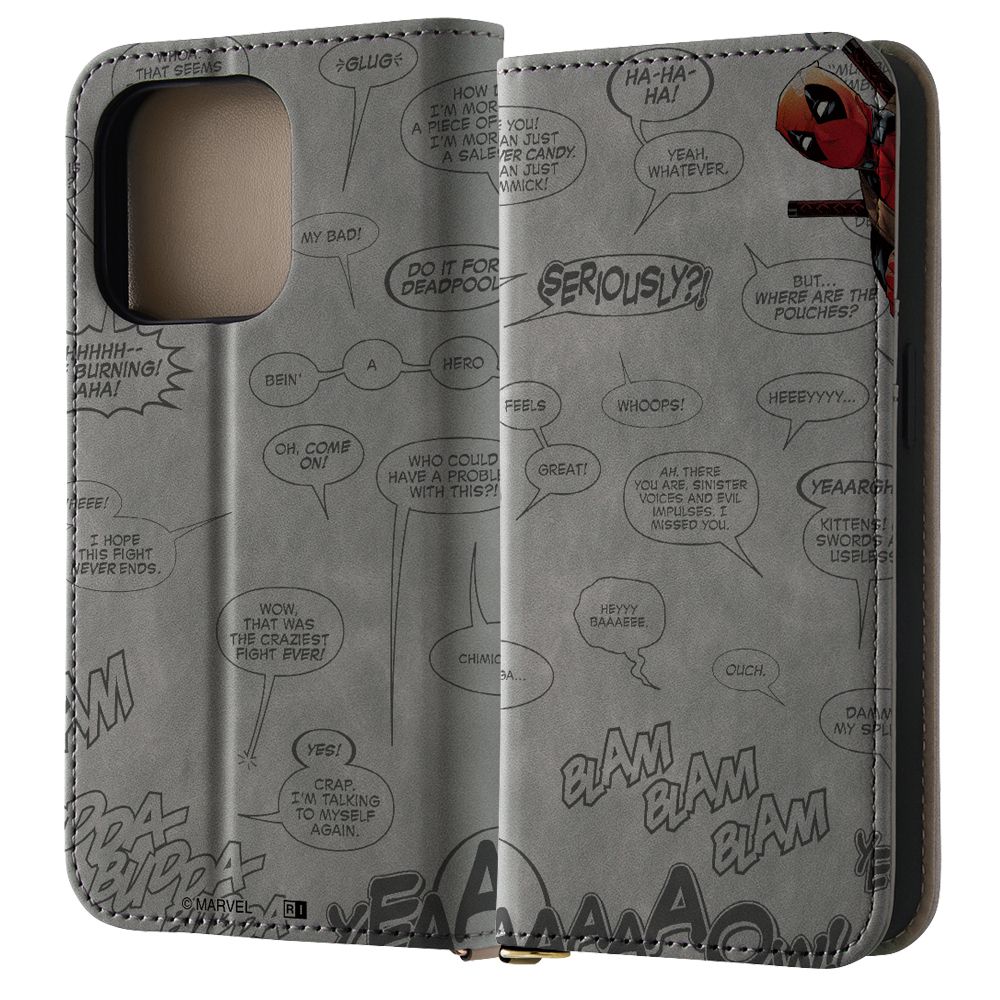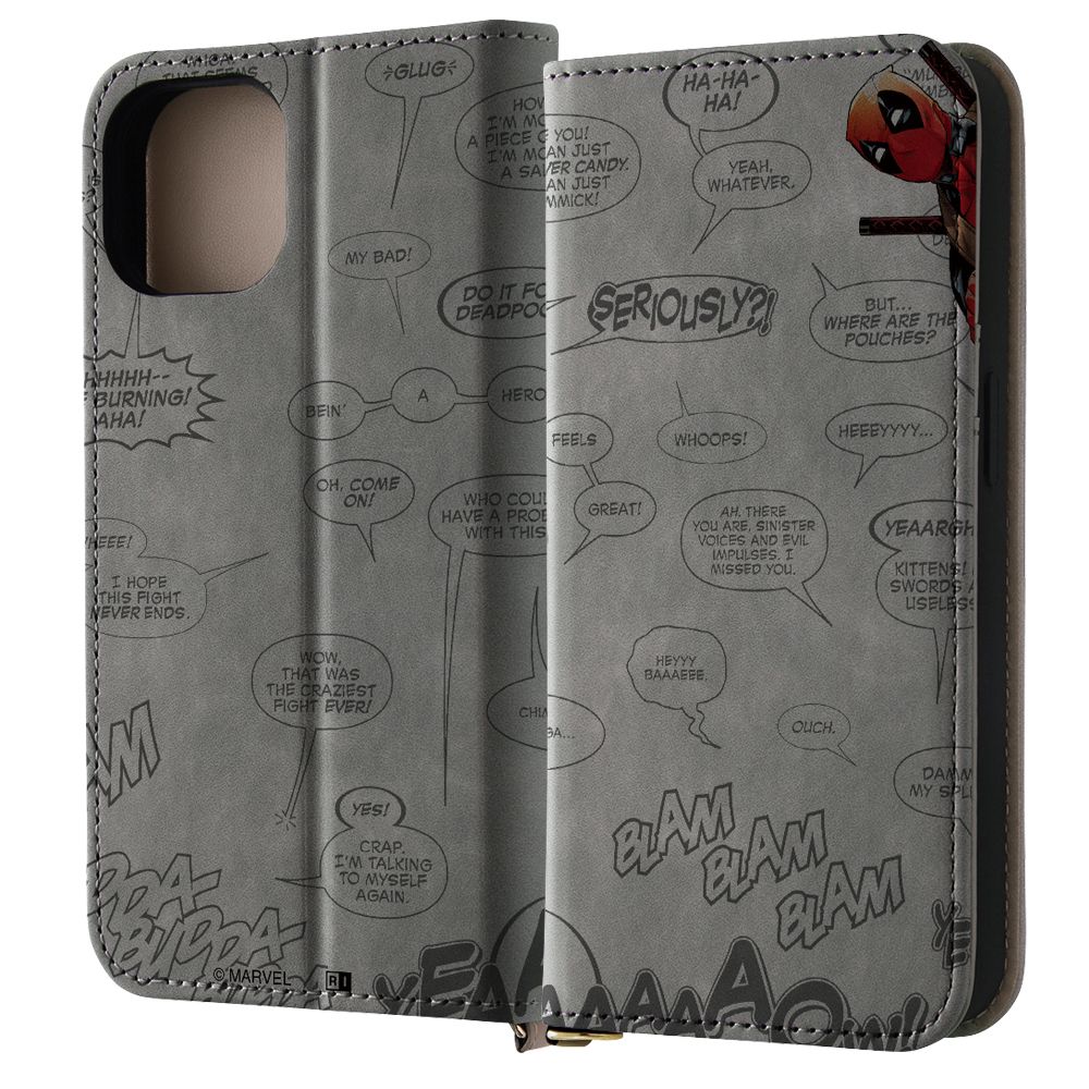 洗練された大人の手帳型ケース"Raffine"表情のあるむら染めPUレザーとトープ色のPUレザーを組み合わせた、『デッドプール』のデザインがプリントされた手帳型ケース。マグネットを使用していないため、磁気が入ったカード等も収納いただけます。キャラクター名: デッドプール ( DEADPOOL )( ウェイド・ウィルソン )ストラップホール付き でっどぷーる ウェイド・ウィルソン アメコミ コミック ヒーロー X-MEN セリフ ひょっこり グレー 灰色 MARVEL マーベル まーべる でぃずにー