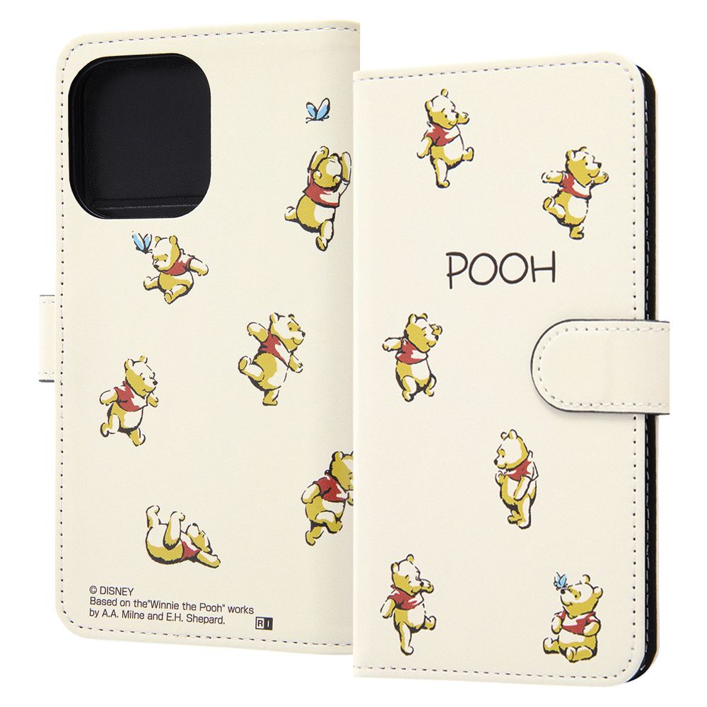 ディズニーキャラクターのアートデザインが全面にプリントされたマグネット付きレザーケース。マグネット式なのでケースの開閉が簡単に行える。お好きなカードが入れられるICカードポケット付き。カードやレシートなども入れられる大きめの収納ポケット付き。四つ角エアクッション付。くまのプーさん プー