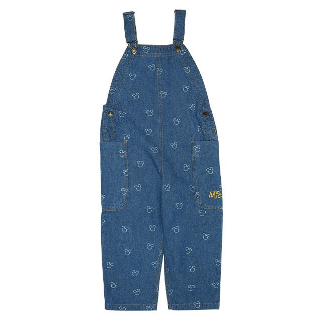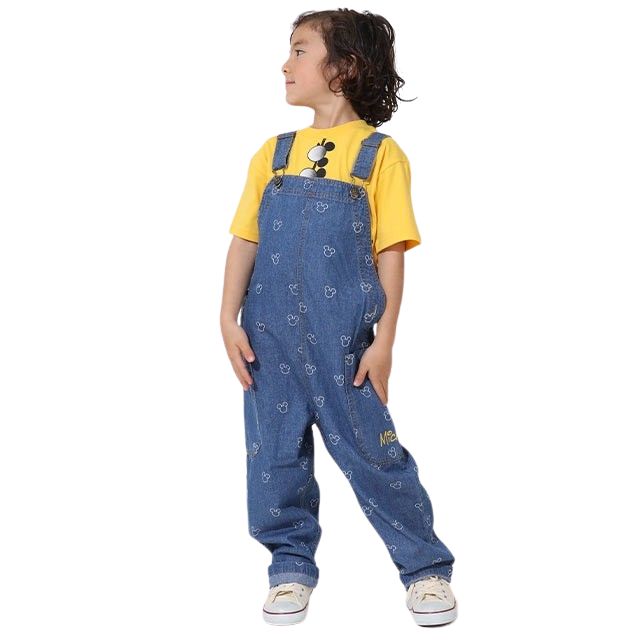 合わせやすいデニム生地に、さりげないミッキーの総柄プリントが可愛らしいサロペット♪