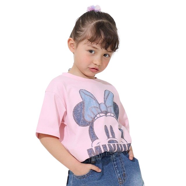 【ベビードール】ミニー 親子お揃い デニム貼付風Tシャツ 9466K / ベビーサイズ キッズ リンクコーデ ペアルック 親子コーデ トップス 半袖 天竺素材