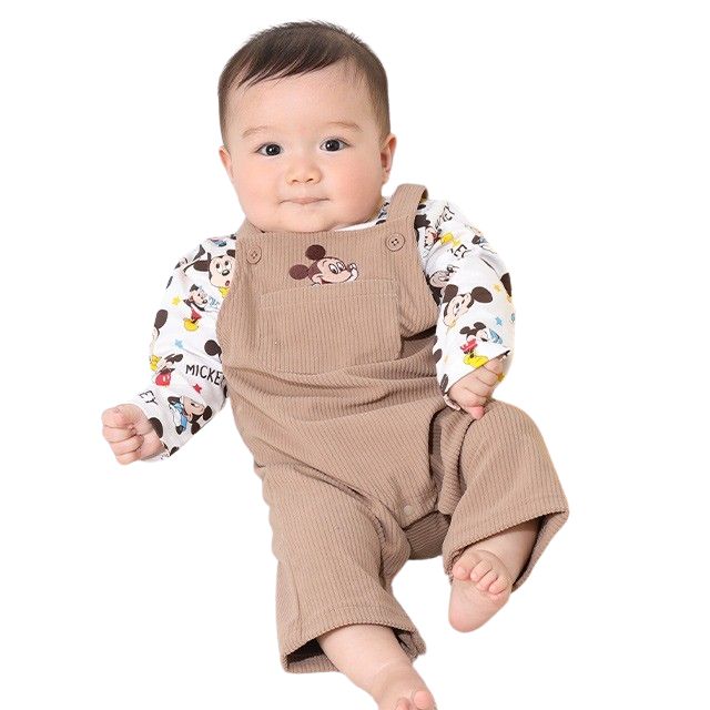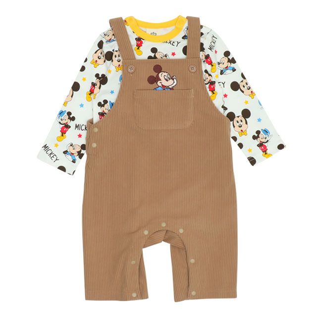 可愛いミッキーとミニーのボディスーツとふんわり暖かみのあるコーデュロイ生地のサロペットがおしゃれ♪