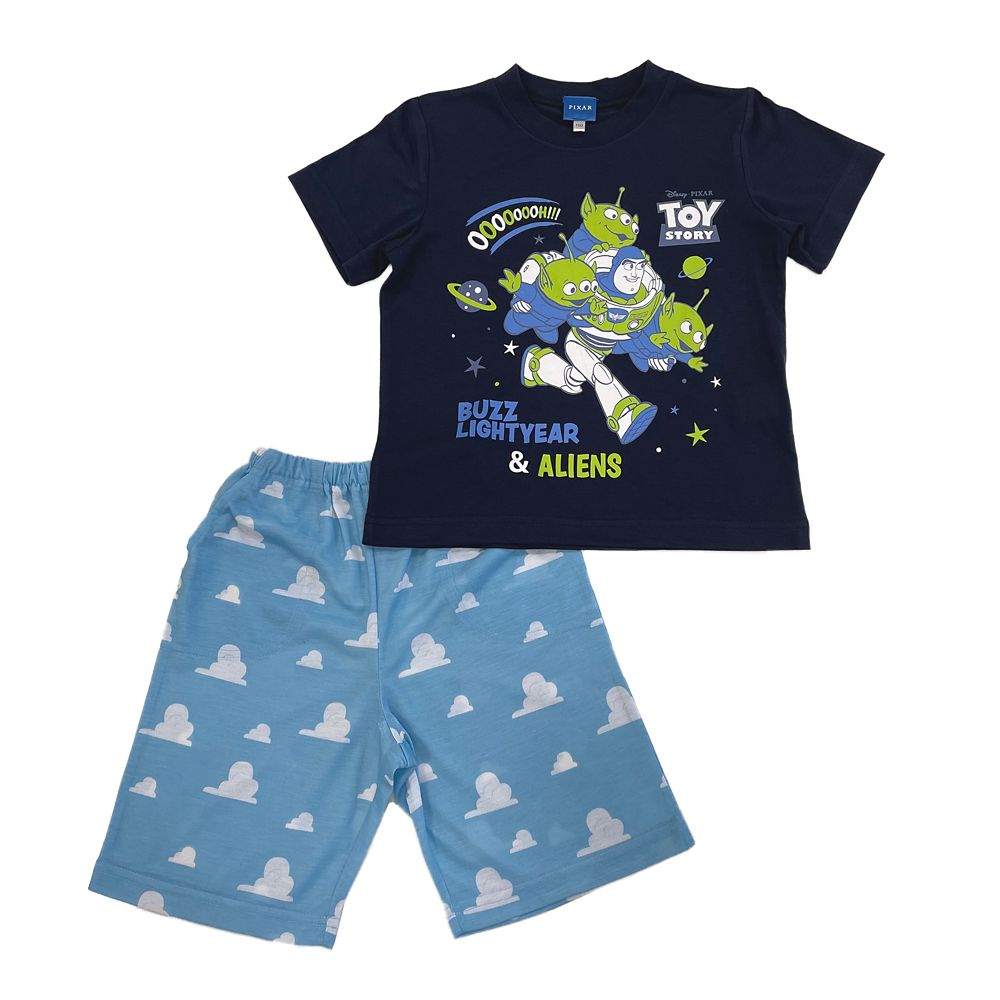 上着はバズとリトル・グリーン・メンを大胆にプリントし、パンツはお馴染みの雲柄が総柄にプリントされた夏らしいデザイン♪