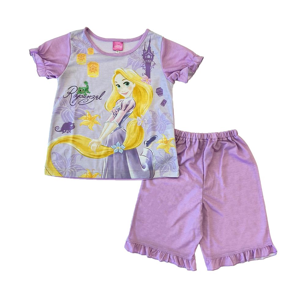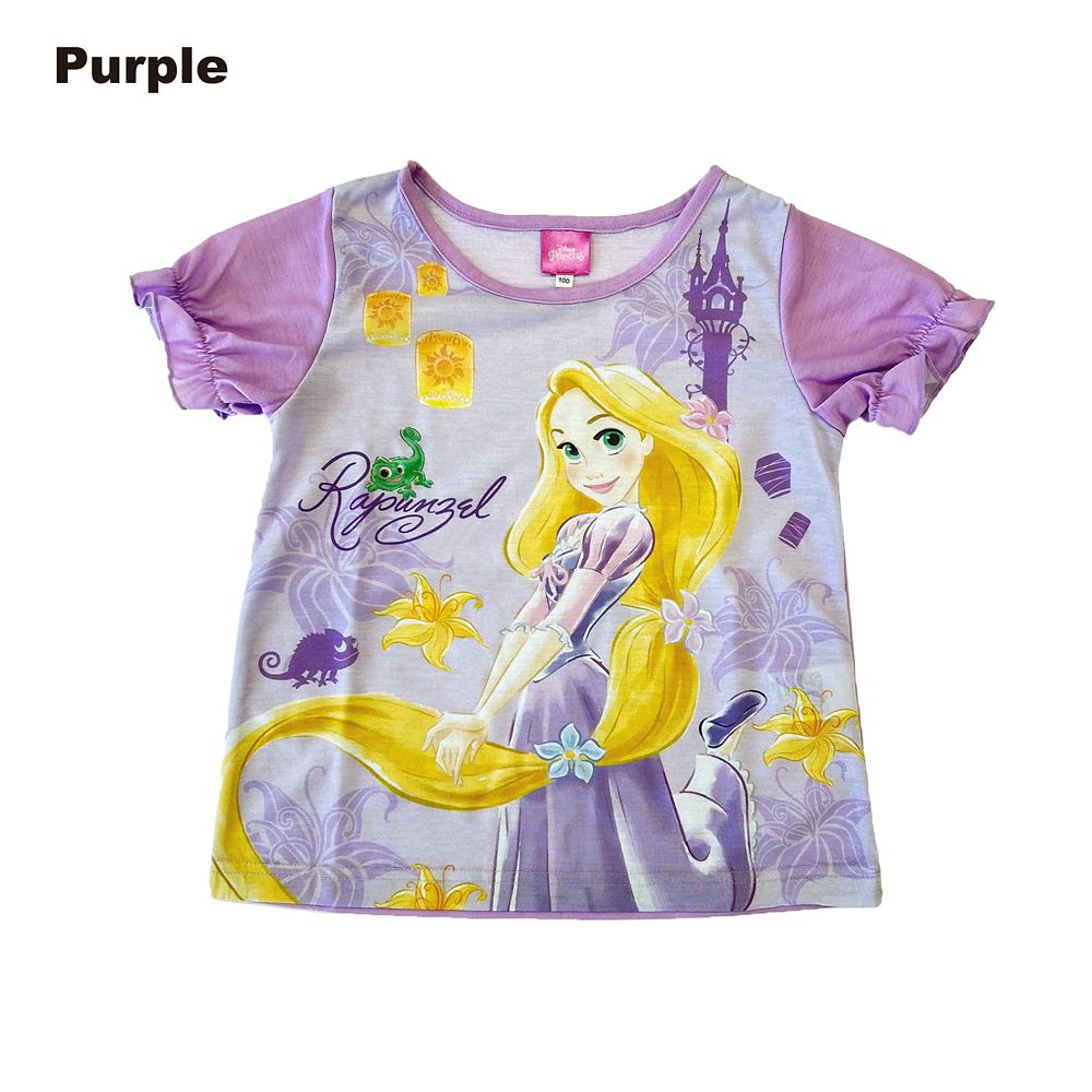 ラプンツェルの大きなプリントされた半袖上着と無地のハーフパンツの組み合わせです☆