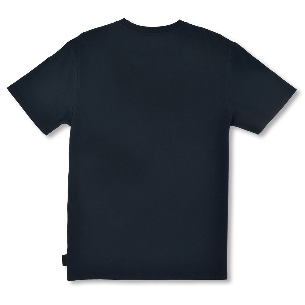 モノクロベースのTシャツに赤色のロゴ刺しゅうが映えます。左脇の縫い付けがさりげないアクセントです。