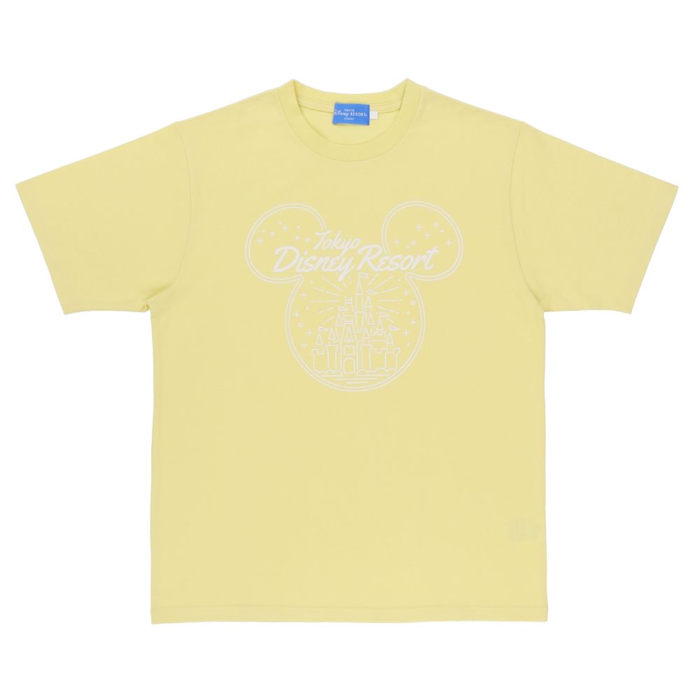 ミッキーシェイプの中に東京ディズニーランドのシンデレラ城がデザインされたイエローのTシャツです。