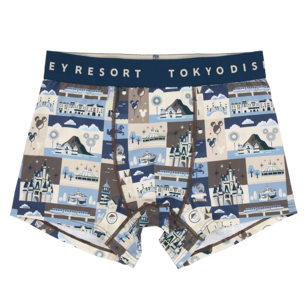 東京ディズニーリゾートのさまざまなアイコンとミッキーなどがデザインされたボクサーパンツです。