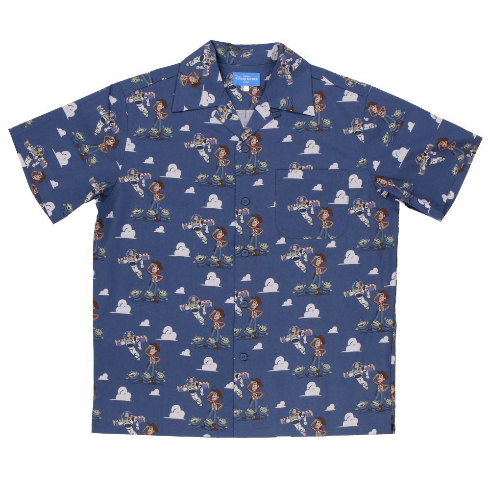 映画『トイ・ストーリー』シリーズに登場する、ウッディ、バズ、リトルグリーンメンがプリントされたアロハシャツ。
