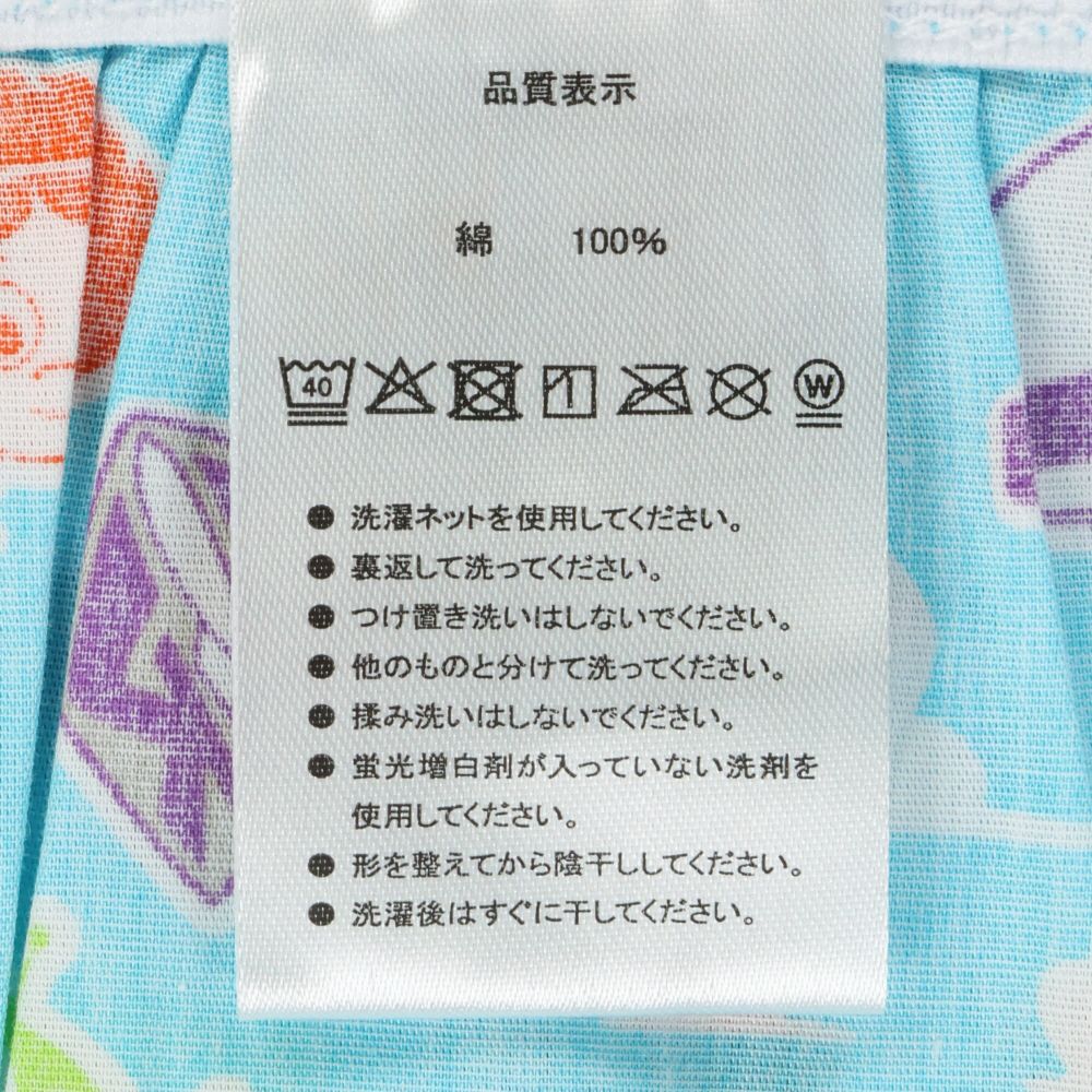 明るいブルーをベースに、キャラクターたちが総柄でデザインされていて、とってもポップな印象です。