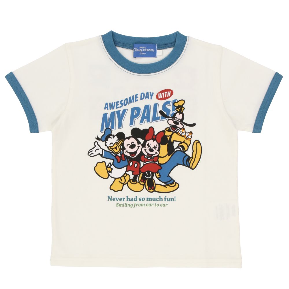 はじける笑顔と元気いっぱいのミッキーたちがデザインされたキッズ用のTシャツです。
